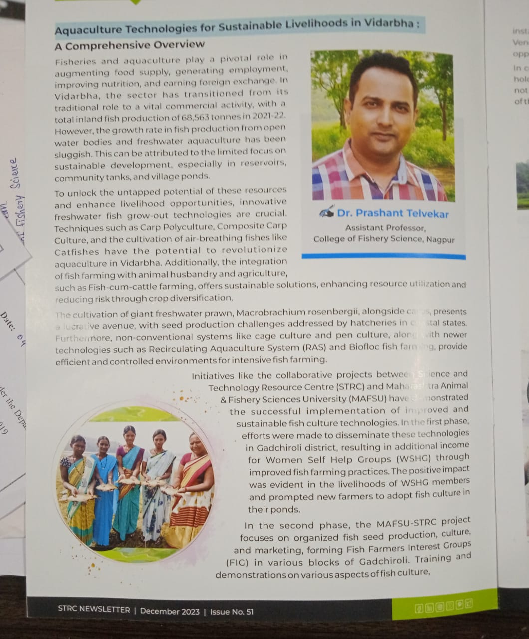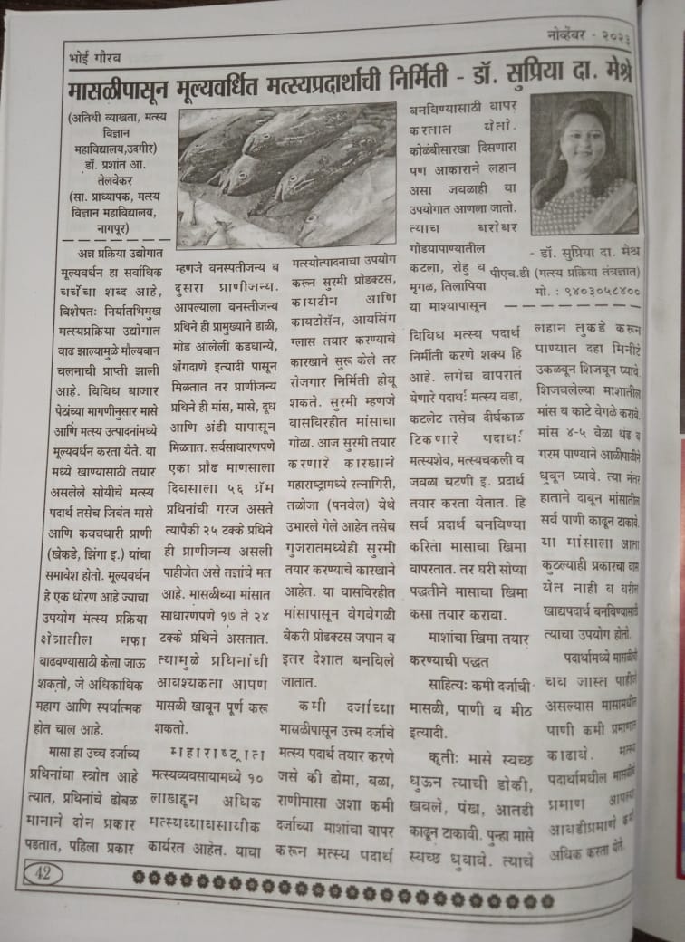 The Department of Fisheries Extension, Economics and Statistics at the College of Fishery Science, Nagpur was established in 2006 and renamed in 2017-18 following the implementation of the Fifth Dean’s Committee syllabus. The department actively conducts extension activities like training programs, field demonstrations, workshops, and seminars across the Vidarbha region. It offers 08 undergraduate courses in the first six semesters and 08 credits under the Student READY Programme in the final year of the B.F.Sc. degree. Research efforts focus on standardizing fish culture practices in village tanks and small reservoirs. The department successfully implemented the project on fish stock enhancement in small reservoirs, achieving a fourfold increase in productivity. Major focus areas include freshwater fish culture technologies like seed production of Indian Major Carps using FRP hatcheries, fingerling rearing, fish culture in polythene-lined ponds, and farming of tilapia and Pangasius spp. The faculty has completed several projects funded by DST, NFDB, RGSTC, and STRC, promoting technologies such as fish seed rearing, cage culture, IMC seed production, diversified fish farming, and live fish marketing.